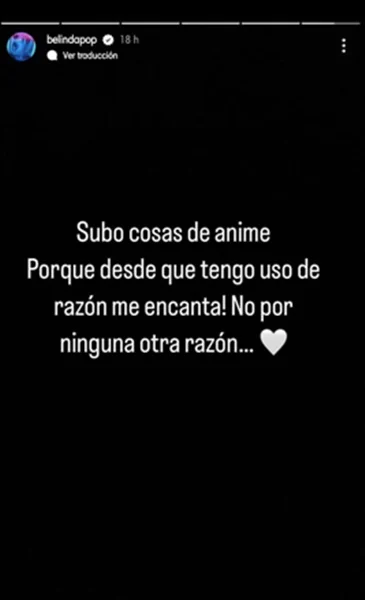 Lo que llamó la atención fue la química entre el joven y Beli, además de algunas imágenes que la intérprete de “Egoísta” compartió en sus redes sociales, en las que se podían ver algunos personajes de anime enamorados, lo que de inmediato, hizo pensar que Beli está enamorada.
