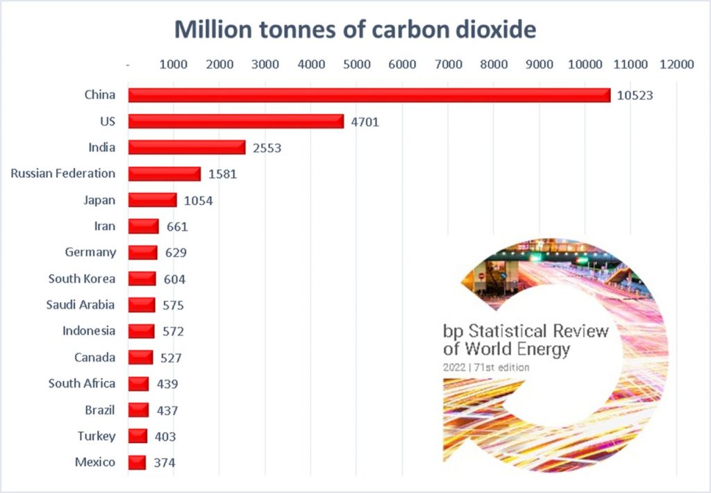 El problema de contaminación mundial se concentra en 5 países que producen el 60% de CO2 de todo el planeta, según muestra la base de datos de BP para el 2021, tan sólo China produjo en ese año 27 veces más toneladas que México, mientras que EU 13 veces más.