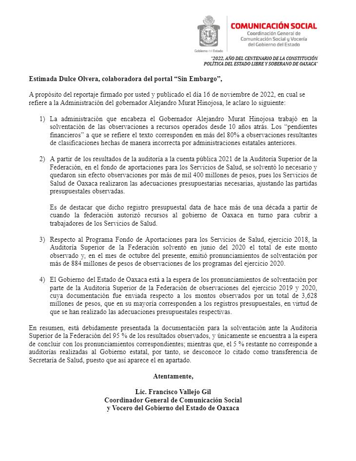 SinEmbargo cuestionó al área de comunicación social del Gobierno saliente de Oaxaca si se aclararon los montos a lo largo de la gestión, pero no respondió hasta el cierre de esta edición. La tarde del miércoles, la Vocería de comunicación social de Oaxaca argumentó que la respuesta no se envió “por algún error en la cuenta de correo oficial”, la cual se adjunta al final de esta nota.https://e.infogram.com/ca9f91e9-5e45-476f-bbdc-d2a01aab160e?parent_url=https%3A%2F%2Fwww.sinembargo.mx%2F16-11-2022%2F4281351&src=embed#async_embed